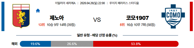 코모1907이 신중하게 대응하겠지만, 홈 경기에서의 거친 경합과 안정감은 제노아가 조금 더 강하게 보여줄 수 있습니다.