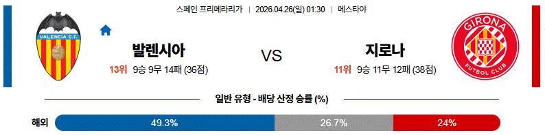 발렌시아가 홈에서 거칠고 강하게 맞붙으며 흐름을 흔들 수는 있지만, 지로나는 빌드업과 세밀한 패스 연결로 이를 풀어낼 능력을 갖추고 있습니다.