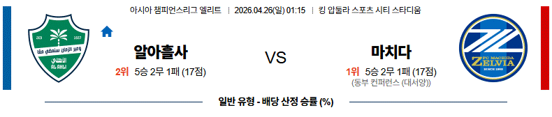 그 지점에서는 알 아흘리(알 아흘사)가 확실히 앞서 있고, 마치다는 전후반 90분 내내 수비에 쫓기다가 체력 소모까지 크게 누적될 가능성을 함께 고려해야 한다.