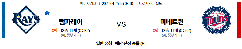 라스무센과 브래들리 모두 이번 시즌 투구는 좋은 편이다. 그리고 공통점도 비슷한 편. 하지만 라스무센은 아무래도 야간 경기라는 중요한 변수가 있기도 하고 미네소타는 원정에서 타격이 꽤 활발하게 이루어지는 팀이다. 미네소타의 승리가 유력해 보인다.