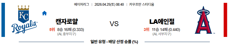 최근 캔자스시티는 홈에서 타격감은 나쁘지 않은 편. 그러나 에인절스가 좌완 상대로 강하다는 점을 잊어선 안된다. 이 경기는 양 팀의 타격이 조금 더 힘을 발휘할수 있는 경기인데 결국 불펜의 우위는 확실히 에인절스가 있고 이 점이 결국 승부를 가를 것이다. 에인절스의 승리 가능성이 더 높다.