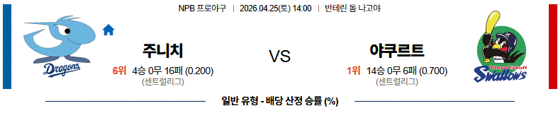 야쿠르트는 폭발력 있는 타선을 보유하고 있으나, 투수 친화적인 구장인 반테린 돔에서는 장타 생산에 다소 고전하는 경향이 있습니다. 원정 마운드의 높은 방어율을 타격으로 상쇄해야 하는 과제를 안고 있으며, 초반 선제 실점을 허용할 경우 경기를 풀어가는 데 어려움을 겪을 가능성이 큽니다.