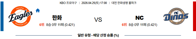 NC는 공수 양면에서 빈틈없는 짜임새를 자랑합니다. 선발 투수의 긴 이닝 소화력과 견고한 수비진의 뒷받침이 승리의 공식이며, 공격에서는 정교한 타격과 주루 플레이를 결합하여 상대 실책을 유도하는 능력이 뛰어납니다. 원정이지만 대전 구장의 특성을 잘 이해하고 있는 노련한 선수들이 많아 안정적인 경기 운영이 기대됩니다.