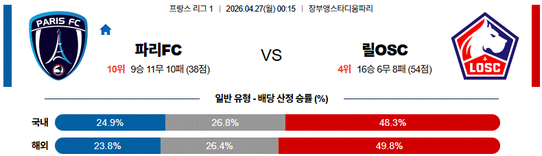 결국 이 경기는 하랄손의 전진 패스와 릴의 2선 침투가 파리FC의 벌어진 간격을 계속 찌르며 원정 쪽으로 흐름을 기울일 가능성이 높다.