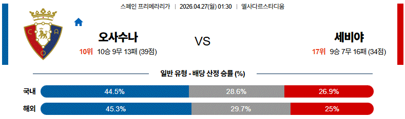 결국 오사수나가 중앙과 세컨드 지역 주도권을 앞세워 세비야 수비 조직을 흔들고, 홈에서 결과까지 챙길 가능성이 높다.