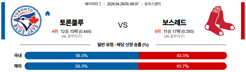 직전 경기에서 수아레즈는 좌완에게 약한 양키스 상대로 고전하고 말았다. 원정임을 고려한다면 이번 경기도 쉽지 않을듯. 시즈의 경우 하루의 휴식 추가는 분명히 도움이 될수 있고 보스턴은 슬라이더를 앞세운 투수에게는 그다지 강하지 않은 편이다. 게다가 토론토의 불펜은 안정화 되어가고 있다. 토론토의 승리가 유력하다.