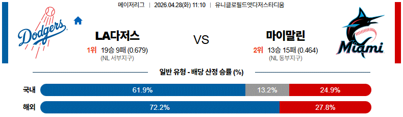 4월 28일 LA 다저스 vs 마이애미 MLB야구분석