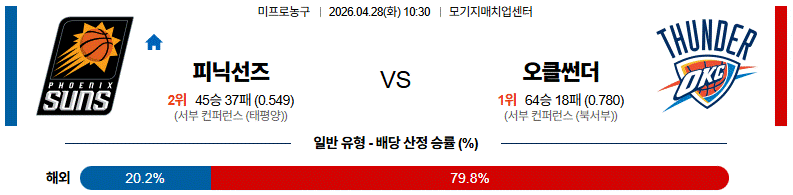 피닉스는 최근 3연패 흐름 속에 수비 집중력과 턴오버 관리에서 문제를 드러내고 있다. 딜런 브룩스와 데빈 부커가 득점에서 역할을 하고 있지만 경기 흐름을 유지하는 힘이 부족하고 무너지는 패턴이 반복되고 있다. 반면 오클라호마는 샤이 길저스-알렉산더를 중심으로 공격 효율과 수비 압박 모두에서 우위를 점하며 경기 주도권을 확실하게 가져가고 있다. 팀 전체적인 밸런스와 조직력이 안정적으로 유지되고 있고 원정에서도 강한 경기력을 이어가고 있는 흐름이다. 오클라호마 승리가 예상된다.