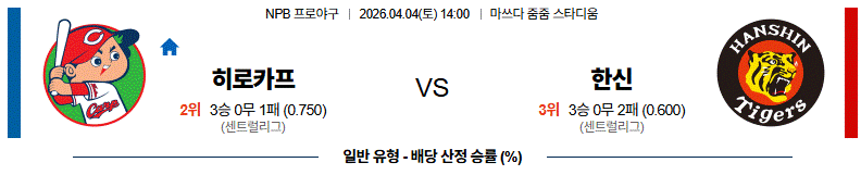 히로시마 도요 카프는 홈 구장 마쓰다 스타디움에서 한신의 강력한 마운드를 상대합니다. 스포츠분석 결과, 히로시마는 최근 선발 로테이션의 안정감이 돋보이며 특히 홈 경기에서 투수진의 피안타율이 현저히 낮아지는 지표를 보이고 있습니다. 타선에서는 기동력을 앞세운 '빨간 헬멧' 특유의 야구가 살아나야 하며, 한신의 견고한 수비를 흔들기 위한 기습적인 작전 수행이 필수적입니다. 경기 초반 선제점을 뽑아내 마운드의 부담을 덜어준다면 승기를 잡을 확률이 매우 높습니다.