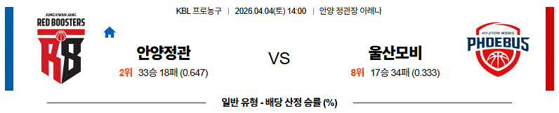 울산 현대모비스는 포스트의 우위를 바탕으로 안양 원정 승리를 노립니다. 이번 데이터 분석상 모비스는 리바운드 수치에서 정관장을 압도하고 있으며, 세컨드 찬스 득점이 리그 최상위권입니다. 외국인 선수의 골밑 장악력과 국내 포워드진의 리바운드 가담이 조화를 이룬다면 정관장의 수비를 무너뜨리는 것은 시간문제입니다. 상대의 외곽 슛 찬스를 제어하기 위한 앞선의 강한 압박 수비가 병행된다면 무난한 승리가 예상됩니다.
