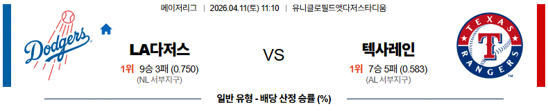 현 시점에서 다저스 최대의 문제는 홈에서의 타격이 원정보다 좋지 않다는 점이다. 그러나 락커는 홈과 원정의 괴리가 큰 투수이기 때문에 이는 다저스에게 유리하게 작용할수 있는 포인트. 게다가 텍사스는 후반 불펜이 아쉬운 편이고 글래스나우가 홈에서 강한 투수라는 점도 생각해야 한다. LA 다저스의 승리가 유력하다.