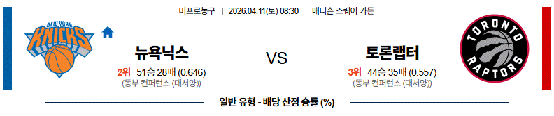 뉴욕은 연속경기 일정이다. 뉴욕은 직전경기(4/10) 홈에서 보스턴 상대로 112-106 승리를 기록했으며 이전경기(4/7) 원정에서 애틀랜타 상대로 108-105 승리를 기록했다. 4연승 흐름 속에 리바운드 31-42, 3점슛 15-16, 턴오버 7-10의 결과. 조쉬 하트(26득점)가 4쿼터에만 15득점을 몰아치며 클러치에서 결정적인 역할을 했고 제일런 브런슨(25득점 10어시스트)이 경기 운영과 득점을 동시에 책임지며 팀 공격을 이끌었던 경기. 특히, 경기 막판 연속 3점슛으로 흐름을 완전히 가져오며 승부를 뒤집었고 전반적으로 집중력 높은 경기 운영을 보여줬던 상황. 시즌 막판 순위 경쟁 상황에서 중요한 승리를 챙기며 동부 상위권 경쟁을 이어갈 수 있는 발판을 마련했다. 정규시즌 홈경기에서는 6연승 흐름속에 29승9패 성적.
