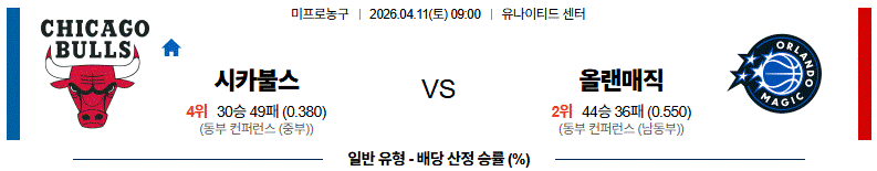 시카고는 연속경기 일정이다. 시카고는 직전경기(4/10) 원정에서 워싱턴 상대로 119-108 승리를 기록했으며 이전경기(4/8) 원정에서 워싱턴 상대로 129-98 승리를 기록했다. 7연패에서 벗어나는 승리가 나온 이후 2연승에 성공했으며 리바운드 51-52, 3점슛 9-10, 턴오버 15-17의 결과. 레너드 밀러(26득점 11리바운드)가 커리어 하이를 기록하며 골밑에서 중심을 잡았고 트레 존스(31득점)와 콜린 섹스턴(27득점)이 외곽과 돌파에서 득점을 몰아치며 공격을 이끌었던 경기. 3명의 선수가 높은 야투 성공률을 바탕으로 효율적인 공격 흐름을 만들었고 3쿼터 막판 16-4 런을 통해 승부를 결정지었던 상황. 특히, 트레 존스가 연속 득점으로 흐름을 완전히 가져오며 경기 주도권을 확실하게 잡았고 전체적으로 공격 완성도가 돋보인 경기였다. 정규시즌 홈경기에서는 2연패 흐름속에 18승22패 성적.