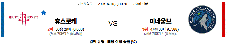 휴스턴은 연속경기 일정이다. 휴스턴은 직전경기(4/10) 홈에서 필라델피아 상대로 113-102 승리를 기록했으며 이전경기(4/8) 원정에서 피닉스 상대로 119-105 승리를 기록했다. 8연승 흐름 속에 리바운드 53-47, 3점슛 11-11, 턴오버 15-16의 결과. 케빈 듀란트(29득점)가 해결사 역할을 맡으며 공격을 이끌었고 자바리 스미스 주니어(19득점), 아멘 톰슨(19득점)이 고르게 득점을 보태며 안정적인 공격 흐름을 이어갔던 경기. 3쿼터 종료 시점까지 23점 차 리드를 만들며 경기를 지배했고 상대의 추격 흐름 속에서도 듀란트의 3점슛과 애런 홀리데이의 외곽포로 다시 격차를 벌리며 흐름을 끊었던 상황. 전체적으로 경기 운영 완성도와 클러치 대응에서 앞서며 8연승 흐름을 이어갔다. 정규시즌 홈경기에서는 6연승 흐름속에 29승10패 성적.