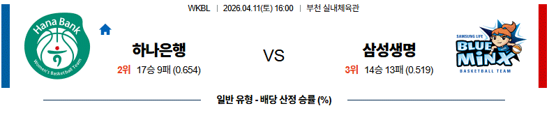 용인 삼성생명은 골밑에서의 리바운드 우위를 점할 수 있는 확실한 포스트 자원을 보유하고 있습니다. 하나은행의 외곽 공세를 노련한 수비 로테이션으로 차단하고, 공격 리바운드 이후의 세컨드 찬스 득점을 노리는 안정적인 운영을 보여줄 것입니다. 베테랑 선수들의 승부처 해결 능력이 탁월하여 쿼터 후반 집중력 싸움에서 우위를 점할 것으로 보입니다.