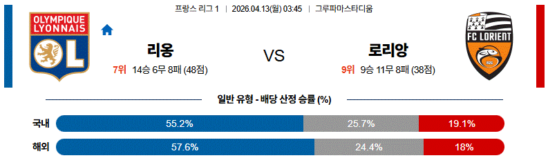 리옹은 홈에서 공격 템포를 끌어올리며 경기 흐름을 가져갈 가능성이 높고, 로리앙은 수비 후 역습으로 대응할 전망입니다.