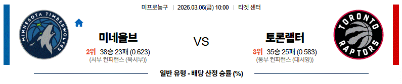 미네소타는 최근 4연승 상승 흐름 속에서 앤서니 에드워즈를 중심으로 공격력이 크게 살아난 모습이다. 멤피스전에서는 에드워즈가 41득점으로 공격을 이끌었고 줄리어스 랜들이 23득점 11리바운드 더블더블로 골밑을 지켰다. 또한, 아요 도순무가 벤치에서 득점을 보태며 공격 균형을 유지했고 리바운드에서도 큰 우위를 보였다. 반면, 토론토는 최근 4경기 1승3패로 흐름이 좋지 않으며 뉴욕전에서도 리바운드 열세와 외곽슛 기복으로 어려움을 겪었다. 미네소타의 승리가 예상된다.