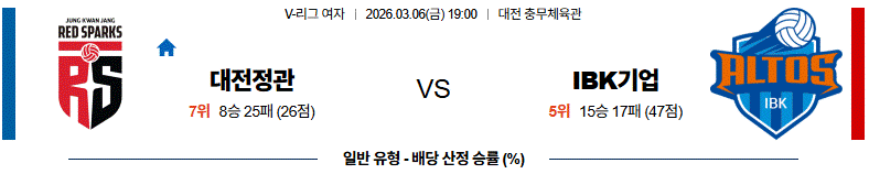 IBK기업은행은 직전경기(2/28) 원정에서 현대건설 상대로 1-3(30:28, 14:25, 18:25, 21:25) 패배를 기록했으며 이전경기(2/25) 홈에서 페퍼저축은행 상대로 3-1(25:16, 18:25, 25:17, 25:15) 승리를 기록했다. 최근 4경기 1승3패 흐름 속에 블로킹 3-6, 서브 4-7, 범실 24-18의 결과. 빅토리아(27득점)가 투혼을 발휘하며 팀 공격을 이끌었고 최정민(12득점), 육서영(10득점), 고의정(8득점)이 힘을 보탰지만 흐름을 이어가지 못했던 경기. 1세트에서는 끈질긴 집중력으로 듀스 승리를 가져왔지만 이후 리시브와 범실에서 흔들리며 주도권을 내줬으며 3세트와 4세트에서 교체 카드를 활용해 추격했지만 결정적인 순간 공격 범실로 흐름을 넘겨줬던 상황. 주전 리베로 임명옥과 킨켈라(시즌아웃)가 결장하고 있는 공백이 표시가 났다. 정규시즌 원정경기에서는 2연패 흐름 속에 7승8패 성적.