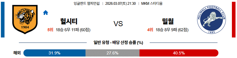 종합적으로 볼 때, 헐시티가 더 많이 공을 잡는 경기일수록 뒷공간을 노리는 밀월의 한 방이 위력을 발휘할 가능성이 높아, 결과는 헐시티 패 방향에 무게가 실리는 승부로 판단된다.