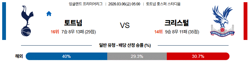 크리스털은 수비 중심으로 버티며 역습 한 방을 노리겠지만, 토트넘이 초반 득점을 만들면 경기 운영이 한층 수월해질 전망입니다.