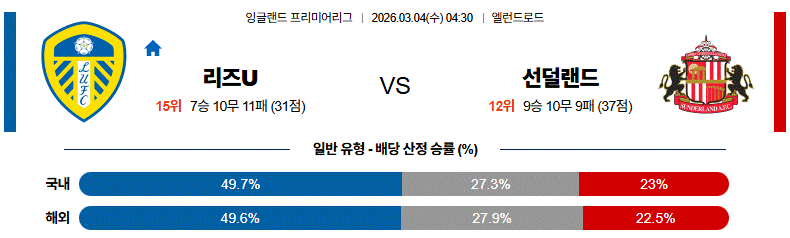 선덜랜드가 수비로 버티겠지만, 경기 전체 주도권은 리즈U 쪽으로 기울 수 있습니다.