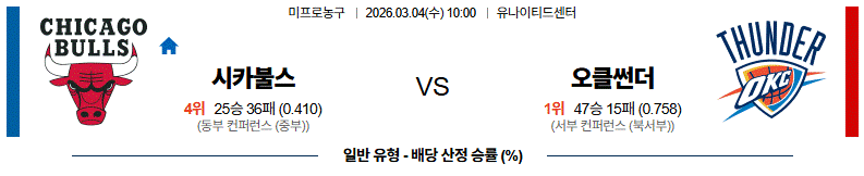 오클라호마시티의 승리를 예상합니다. 시카고가 밀워키를 잡으며 반등의 불씨를 살렸지만, 길저스 알렉산더와 쳇 홈그렌이 버티는 오클라호마시티의 주전 전력은 시카고가 감당하기에 너무 강력합니다. 특히 시카고는 백코트진에 부상자가 많아 SGA의 개인 전술을 제어할 수비 자원이 부족합니다. 벤치 대결에서도 아이재아 조와 에런 위긴스의 화력이 시카고를 압도할 것이며, 오클라호마시티의 유기적인 수비 조직력에 시카고의 공격이 막히면서 경기는 언더 양상으로 흐를 것입니다.