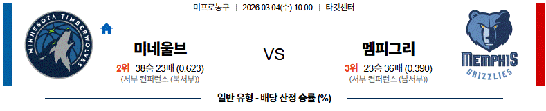 미네소타는 덴버와의 순위 결정전에서 승리하며 서부 컨퍼런스 상위권 경쟁에 박차를 가하고 있으며, 앤서니 에드워즈와 루디 고베어를 중심으로 완벽한 공수 밸런스를 보여주고 있습니다. 반면 멤피스는 자 모란트를 비롯한 주전급 선수들의 대거 이탈에도 불구하고 신예들의 고른 활약으로 연승을 기록 중이지만, 리그 최강 수준의 수비력을 보유한 미네소타의 벽을 넘기에는 객관적인 전력 차이가 큽니다.