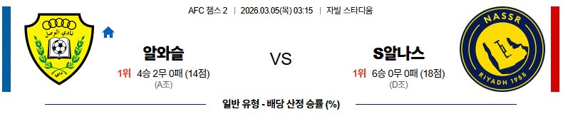 알와슬은 홈에서 강한 압박으로 맞서겠지만, S알나스의 빌드업 완성도와 개인 기량이 승부를 가를 가능성이 있습니다.