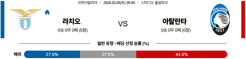 라치오는 안정적인 경기 운영을 바탕으로 균형을 유지하려 하겠지만, 아탈란타의 강한 압박과 빠른 전환이 변수로 작용할 수 있습니다.