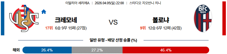 전체적인 흐름은 볼로냐가 주도권을 쥐고 경기를 운영하는 가운데 크레모네가 역습으로 대응하는 형태가 예상됩니다.