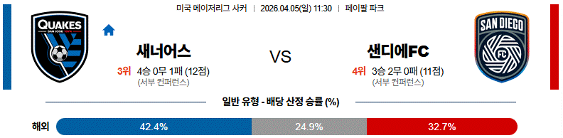 전체 상성만 놓고 보면 산호세(어스퀘이크)가 샌디에고의 빌드업 불안을 정면으로 찌를 수 있는 그림이다.