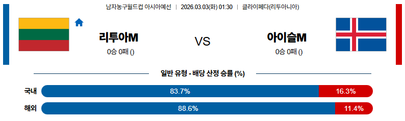 홈과 원정을 바꿔서 펼쳐지는 리턴매치 경기다. 리투아니아는 최근 2연패 흐름이지만 경기 내용에서는 우위를 유지하고 있으며 아이슬란드전에서도 21점 차 리드를 만들 정도로 전력 차이를 보여줬다. 블라제비치(C)의 골밑 장악과 노르만타스(SG), 브라즈데이키스(SF)의 득점 옵션이 안정적이며 홈 경기에서는 수비 집중력과 리바운드 경쟁력이 더 강화되는 흐름이다. 또한 클러치 구간에서 흔들린 경험이 보완될 가능성이 크고 일부 핵심 자원 합류 기대감도 긍정적 요소다. 반면, 아이슬란드는 프리드릭손(PG)의 해결 능력은 뛰어나지만 공격 의존도가 높고 원정에서는 수비 기복이 나타난다. 역전승 이후 흐름 유지 여부도 불확실하다. 리투아니아가 같은 실수 되풀이하지 않을 것이다. 리투아니아 승리가 예상되는 경기. 다만, 핸디캡 범위는 과하다고 생각된다.