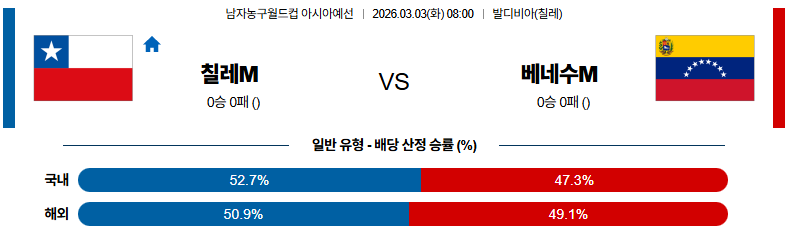 칠레는 최근 3연패 흐름 속에서 경기 초반 주도권을 잡지 못하는 모습이 반복되고 있고 핵심 자원의 이탈로 전력 공백이 뚜렷하다. 하세(PF)가 분전하고 있지만 외곽과 골밑 수비가 동시에 흔들리며 흐름을 유지하지 못하고 있고 결정적인 득점 부족이 이어지고 있다. 또한, 리바운드와 수비 조직력에서도 불안정성이 나타나며 경기 후반 집중력 저하가 문제로 이어지고 있다. 반면, 베네수엘라는 브라질과 콜롬비아를 상대로 접전을 펼치며 경쟁력을 보여줬고 미하레스(PG)의 외곽 생산력과 마테란(SF)의 공격 지원이 강점이다. 턴오버 문제는 변수지만 인사이드와 경험에서 우위가 있으며 상대전에서도 최근 우위를 유지하고 있다. 베네수엘라 승리가 예상된다.