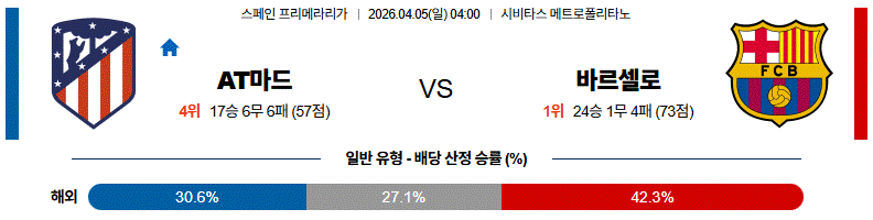 AT마드 vs 바르셀로 최종 분석에서는 전력과 공격 완성도, 최근 흐름을 고려할 때 바르셀로나가 우세한 흐름을 가져갈 가능성이 높은 경기입니다.