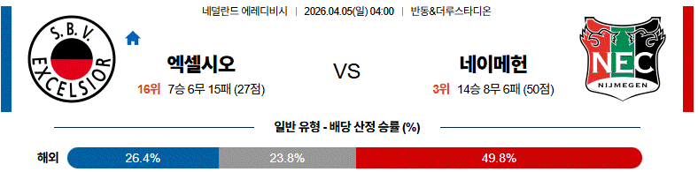 엑셀시오르는 홈에서 공격적으로 나설 가능성이 높고, 네이메헌은 이를 활용해 효율적인 공격 기회를 노릴 수 있는 구조입니다.