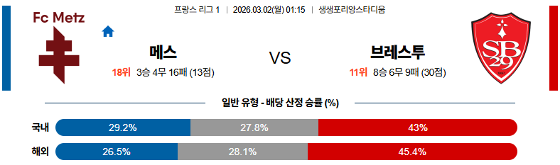메스는 홈에서 점유율과 이어지는 공격 전개를 통해 득점 기회를 꾸준히 만들 전망입니다.