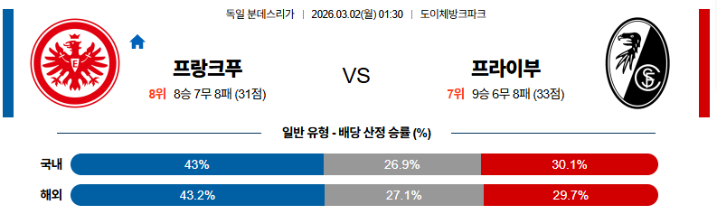 3월 02일 분데스리 프랑크푸 vs 프라이부 해외축구분석