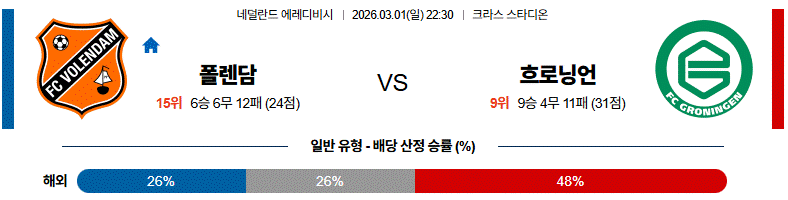 이 경기는 폴렌담의 초반 조직력과, 흐로닝언의 후반 교체 카드가 만들어낼 템포 변화가 맞부딪히는 흐름이 될 가능성이 크다.