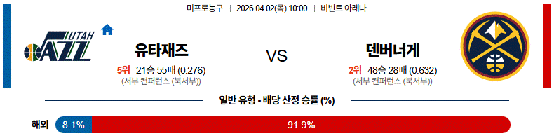 - 유타가 초반 속공과 외곽으로 버텨보겠지만, 덴버가 하프코트에서 더 효율적인 공격을 반복하며 차이를 벌릴 가능성이 높다. 후반엔 원정팀 쪽 운영 안정감이 더 크게 드러날 수 있다.