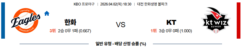 열람 야구 4월 02일 KBO 한화 vs KT 야구분석 1 12 04-01