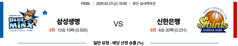 삼성생명은 최근 3경기 2승1패 흐름 속에 이주연과 배혜윤 중심의 공격 안정감이 살아난 모습이다. 골밑과 외곽이 균형을 이루고 있고 강유림의 득점 지원도 이어지며 경기 운영 완성도가 높아지고 있다. 홈 성적은 다소 아쉽지만 상대전에서는 올시즌 5연승으로 강한 우위를 유지하고 있으며 수비 조직력에서도 안정된 흐름을 보이고 있다, 반면, 신한은행은 2연승으로 분위기를 끌어올렸고 신지현 중심의 외곽 공격이 살아났지만 공격 기복과 전력 열세는 여전히 존재한다. 리바운드와 수비 집중력은 개선됐지만 삼성생명과의 상대성에서는 약점이 반복되고 있다. 삼성생명 승리가 예상된다.