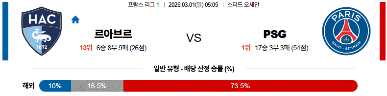 르아브르는 수비 블록을 바탕으로 버티며 역습 한 방을 노리겠지만, 경기 내내 PSG의 압박과 점유율을 견디는 부담이 큽니다.