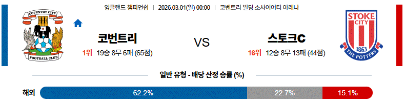 결국 중원 압박 타이밍이 엇갈리는 스토크시티의 현재 상황을 고려하면, 코번트리 쪽이 전술 구조와 홈 환경에서 모두 우위를 점한 상태에서 경기를 풀어갈 수 있는 환경이다.