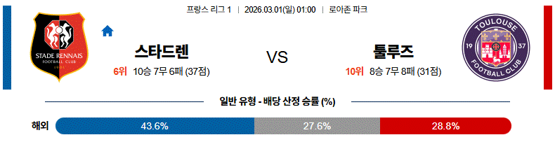 ⚠️ 중앙 빌드업의 완성도와 쓰리백 수비의 포지션 유지 능력까지 모두 감안하면, 이 경기는 스타드 렌 쪽으로 결과가 기울 가능성을 우선적으로 고려해야 하는 한 판이다.
