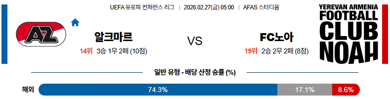 알크마르는 홈에서 점유율과 공격 전개 완성도를 앞세워 흐름을 주도할 가능성이 높습니다.