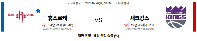 주전 대거 이탈로 전력이 약화된 새크라멘토를 상대로 높이와 화력에서 앞서는 휴스턴이 승리할 것입니다.