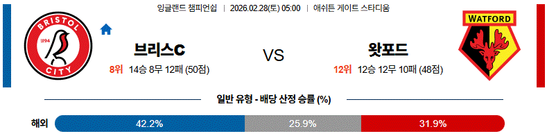 열람 축구 2월 28일 EFL챔 브리스C vs 왓포드 해외축구분석 1 6 02-26