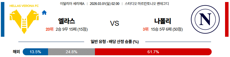 따라서 이 경기는 베로나가 버티는 시간이 길어지더라도, 결국 나폴리의 측면 공략과 크로스 패턴이 경기 흐름을 자신들에게 유리하게 가져갈 가능성이 높은 맞대결이다.