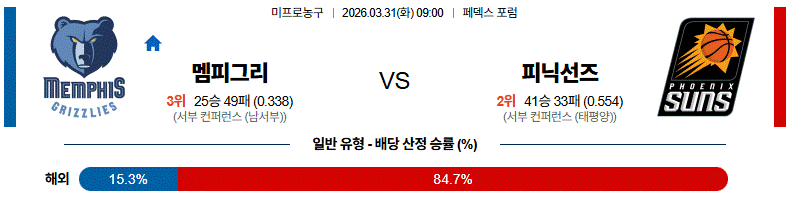 - 승패는 피닉스 쪽이 더 자연스럽고, 멤피스 수비 붕괴가 나오면 오버 가능성도 높다.