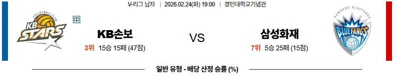 KB손해보험은 직전 우리카드전에서 풀세트 접전 끝에 패했지만 비예나와 임성진을 중심으로 공격 경쟁력은 유지되고 있으며 홈에서는 안정적인 경기력을 보여주고 있다. 범실 관리가 변수였지만 아시아쿼터 아밋의 출전 가능성이 높아지면서 공격 옵션과 높이에서 보강 효과도 기대된다. 상대전에서도 최근 우위를 유지하고 있어 흐름은 나쁘지 않은 모습이다. 반면, 삼성화재는 9연패 흐름 속에 결정력 부족과 범실 문제가 반복되고 있으며 젊은 선수 중심 전력 특성상 경기 흐름이 흔들리면 회복이 늦어지는 모습이다. 원정에서도 5연패로 경기력 기복이 이어지고 있어 KB손해보험 승리가 예상된다.